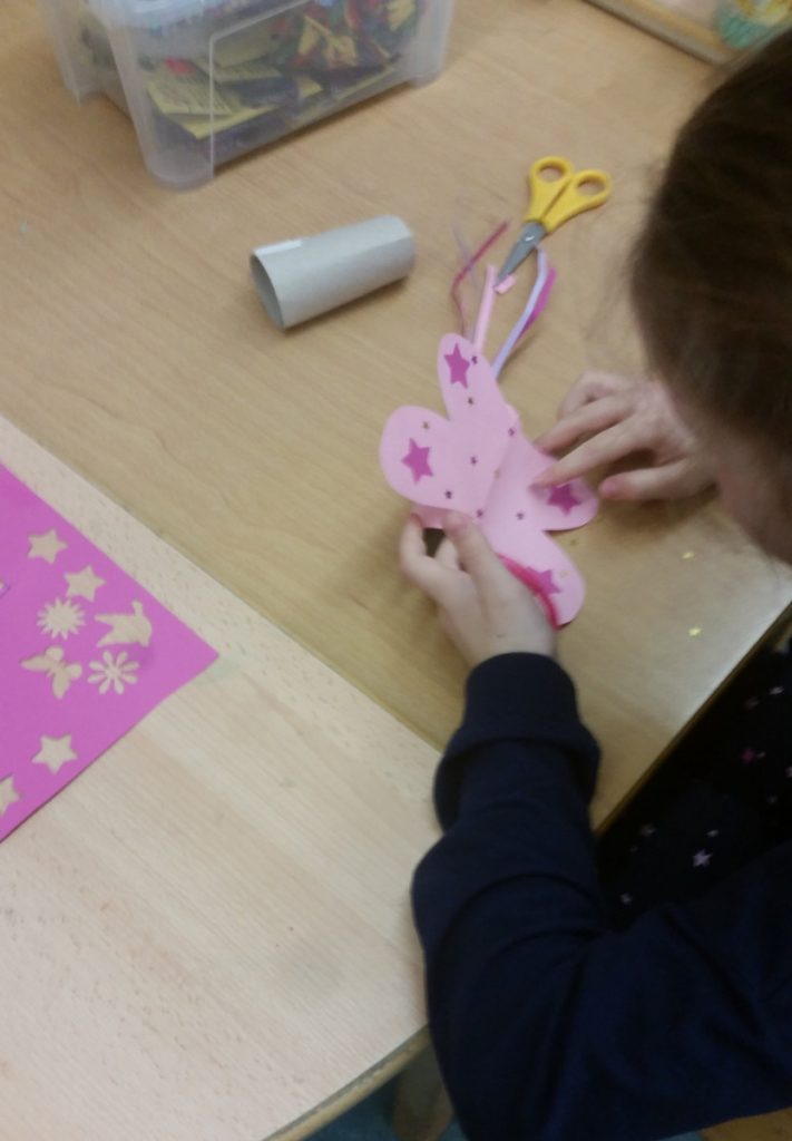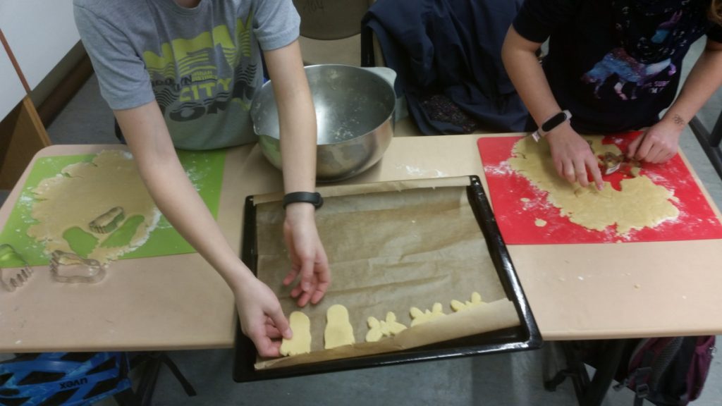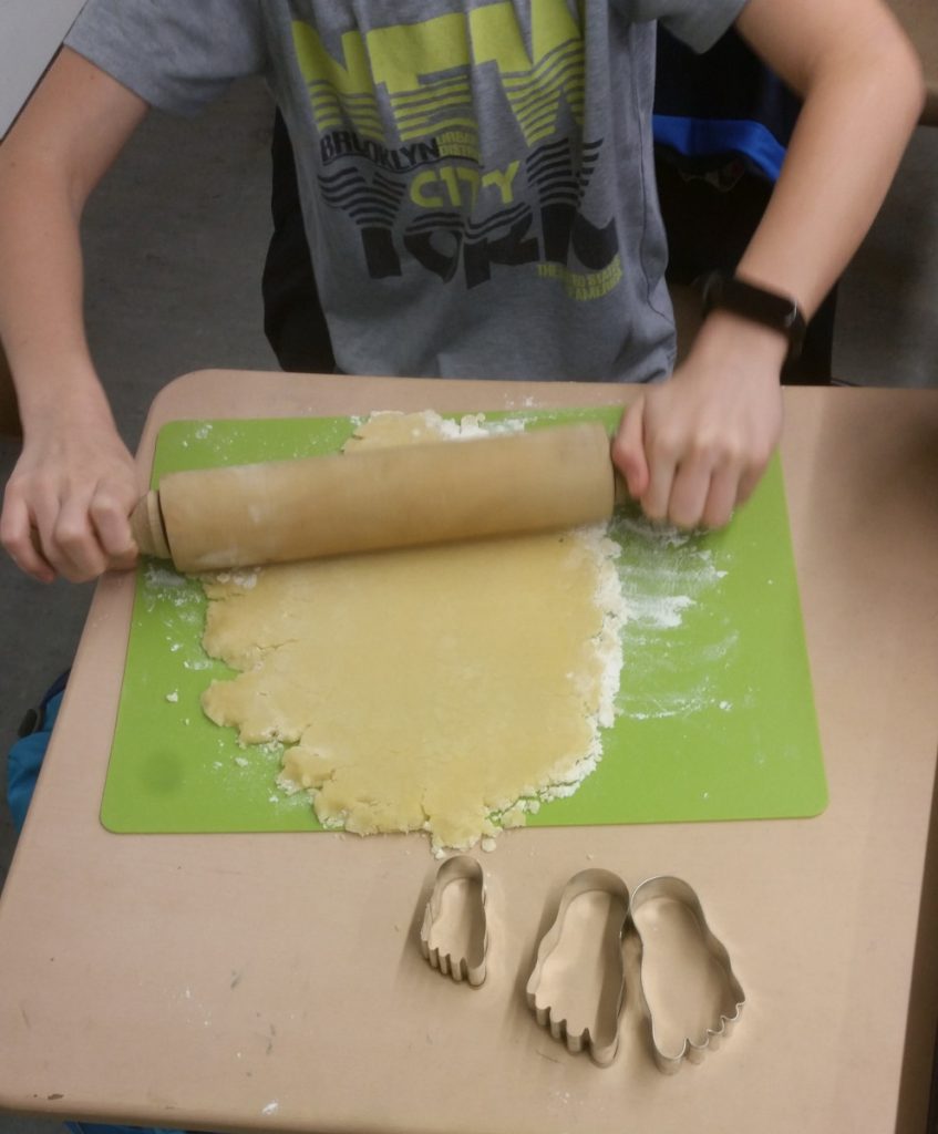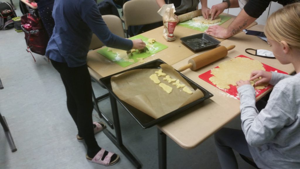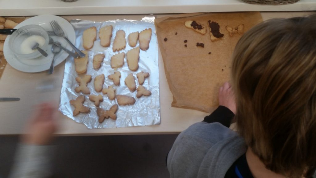 Am Montag starteten wir mit Plätzchen backen, schließlich stand auf der Tafel noch das Datum 16.12.2020, also eindeutig Plätzchen-Zeit. Es wurde gerollt, ausgestochen und mit Mehl eingestäubt (ja, manchmal rieselte das Mehl durch den ganzen Raum). Dabei haben wir herausgefunden, dass diese Geschichte, das zu viel rohen Teig zu naschen Bauchschmerzen verursacht, entweder nicht stimmt oder wir nicht genug genascht haben. Auch in fertiger Form waren unsere „Füße“ und „Schmetterlinge“ ausgesprochen lecker, was auch von den anderen Kindern und Erzieher*innen bestätigt wurde: klar, geteilt wurde auch.