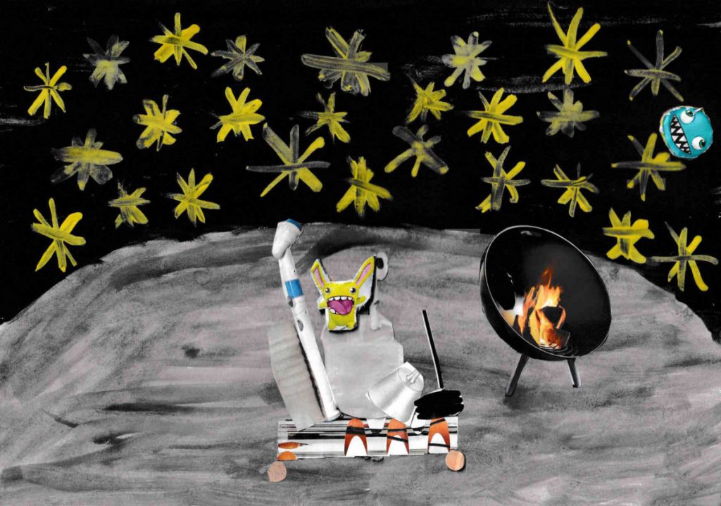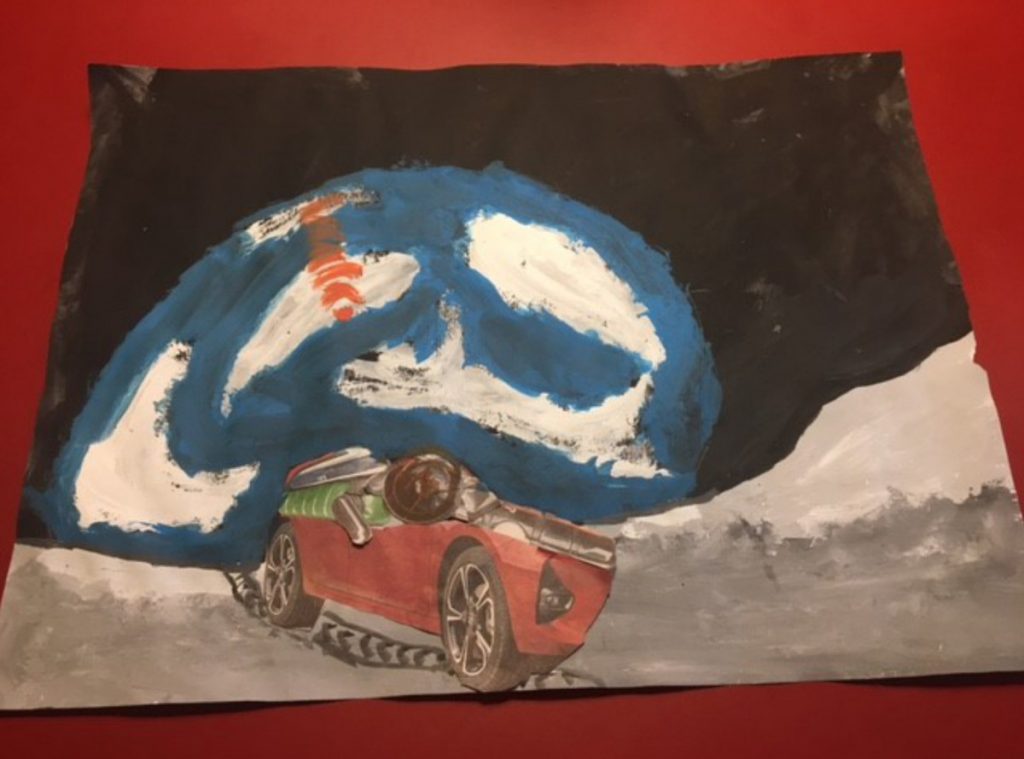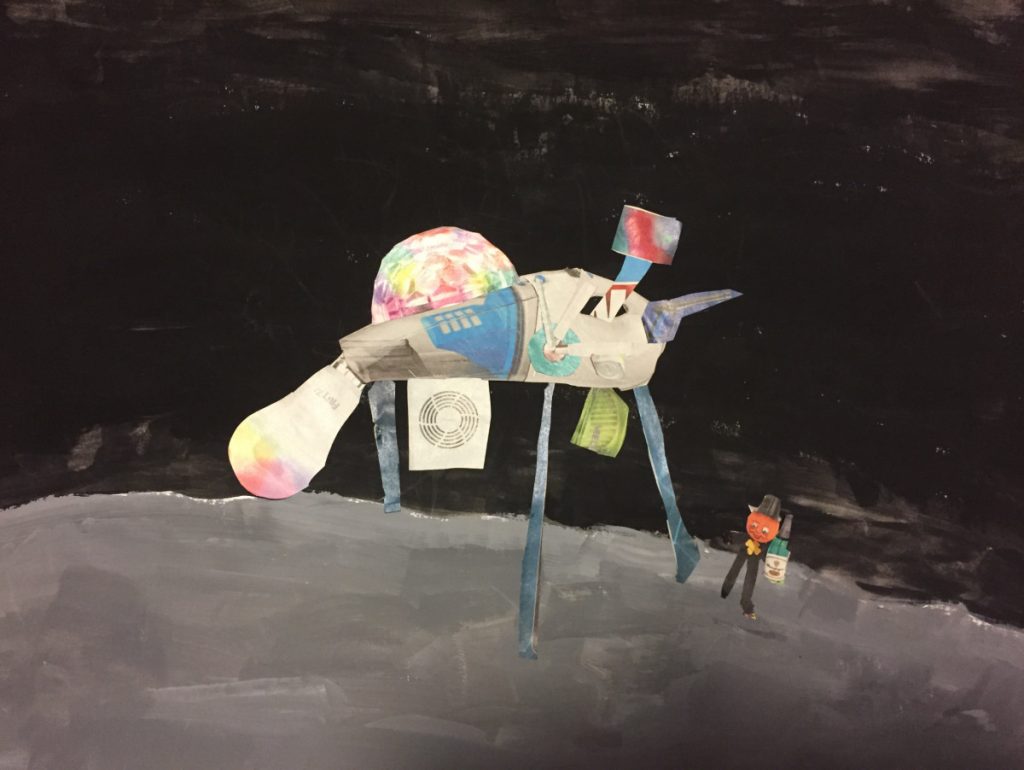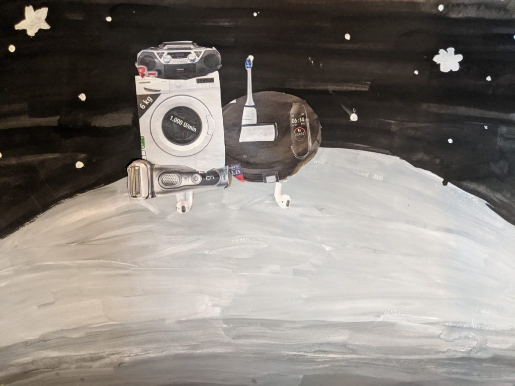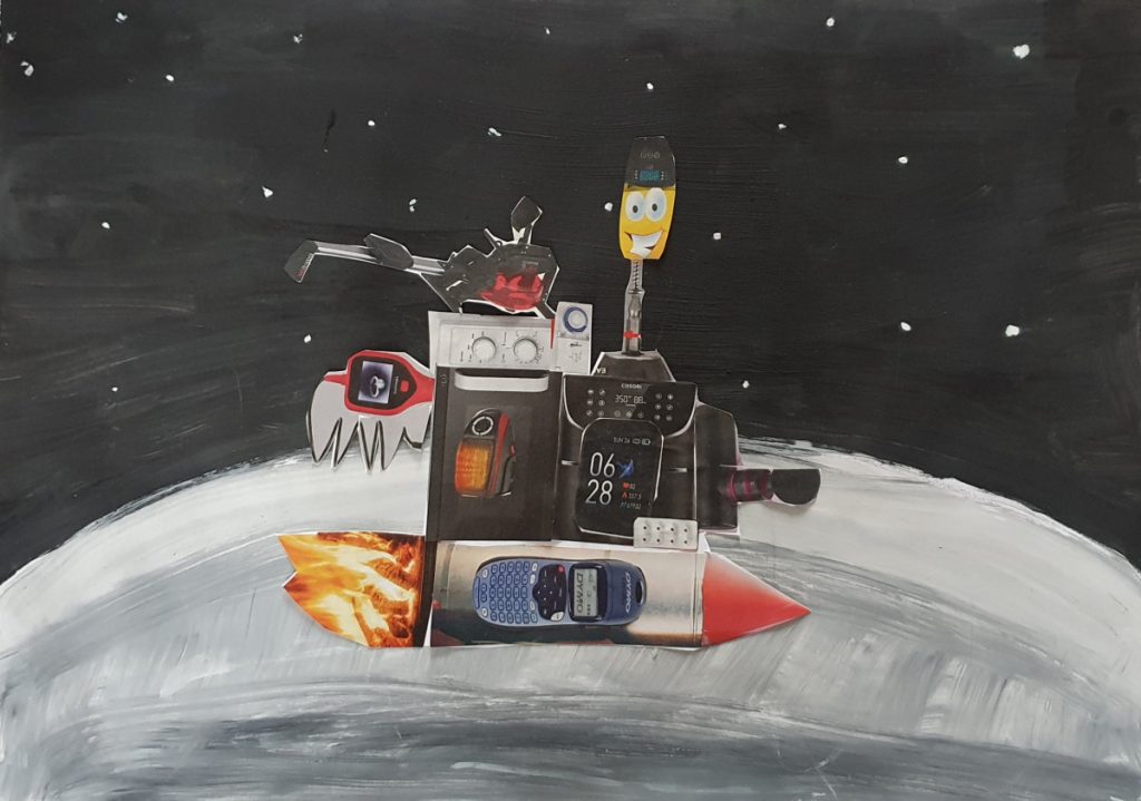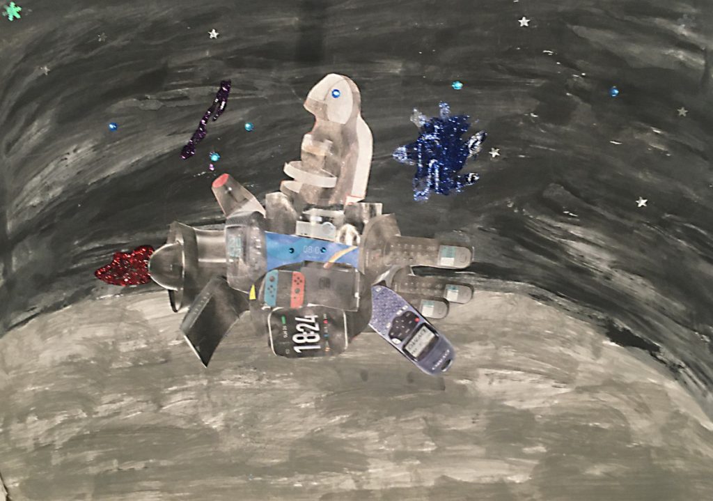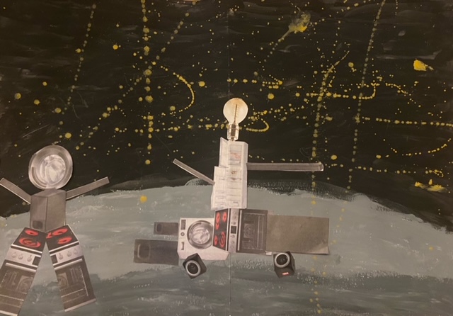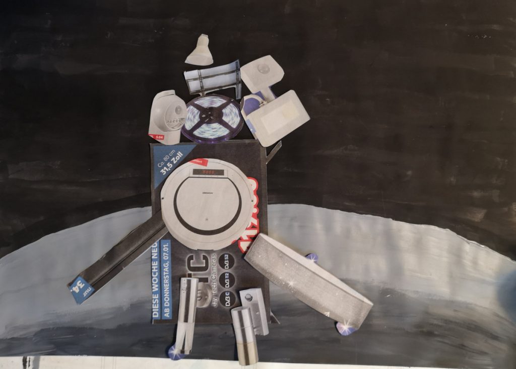 Alle 3. Klassen haben für das Lernen zu Hause von Frau Rost eine Kunstaufgabe erhalten: Wir sollten Weltraumfahrzeuge gestalten. Der Hintergrund ist mit Wasserfarben gemalt. Das Weltraumfahrzeug sollte aus ausgeschnittener Werbung für Elektroanzeigen oder Ähnlichem gestaltet werden. Wir haben in der Klasse 3b ganz viele tolle Bilder gestaltet.